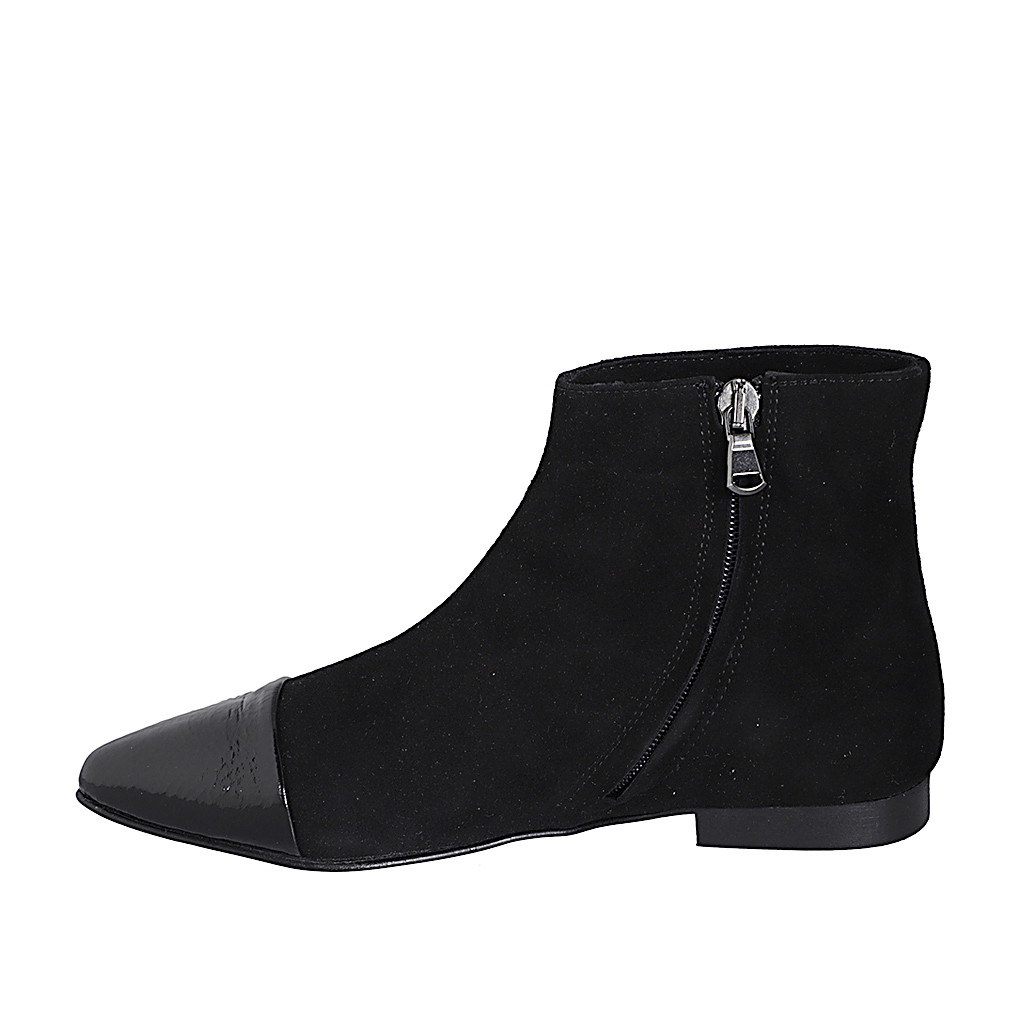 Botines a punta para mujer en gamuza negra con cremallera interior y punta en charol negro tacon 2 - Tallas disponibles:  33, 34, 35, 42, 43, 44, 45, 46