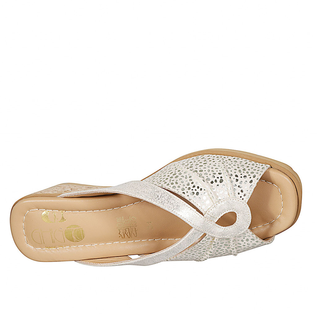 Sabo para mujer en piel imprimida platino y gamuza beis con lunares imprimidos platinados cuña 6 - Tallas disponibles:  43, 44