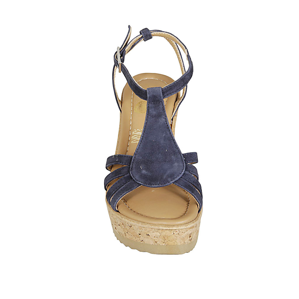 Sandalia con cinturon para mujer en gamuza azul cuña 9 - Tallas disponibles:  42, 44
