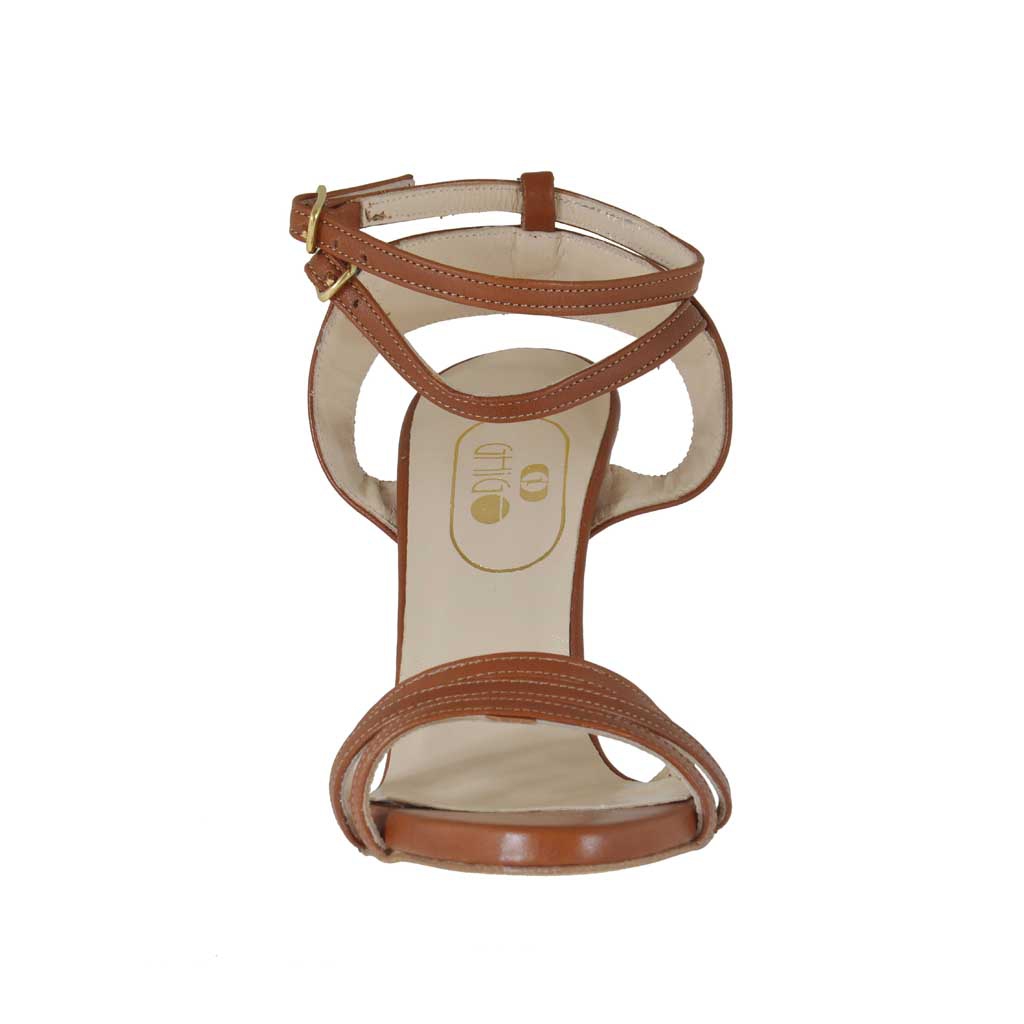 Sandalia para mujer con cinturones al tobillo, altura tacon 9 cm., en piel de color cuero, fondo en cuero, forro en piel. Disponible en tallas pequeñas y en tallas grandes.