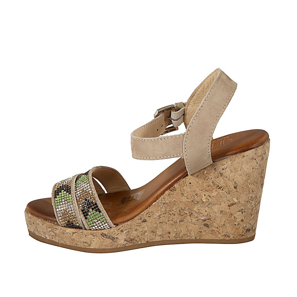 Sandalia para mujer en gamuza beis con cinturon, estras, plataforma y cuña 9 - Tallas disponibles:  42