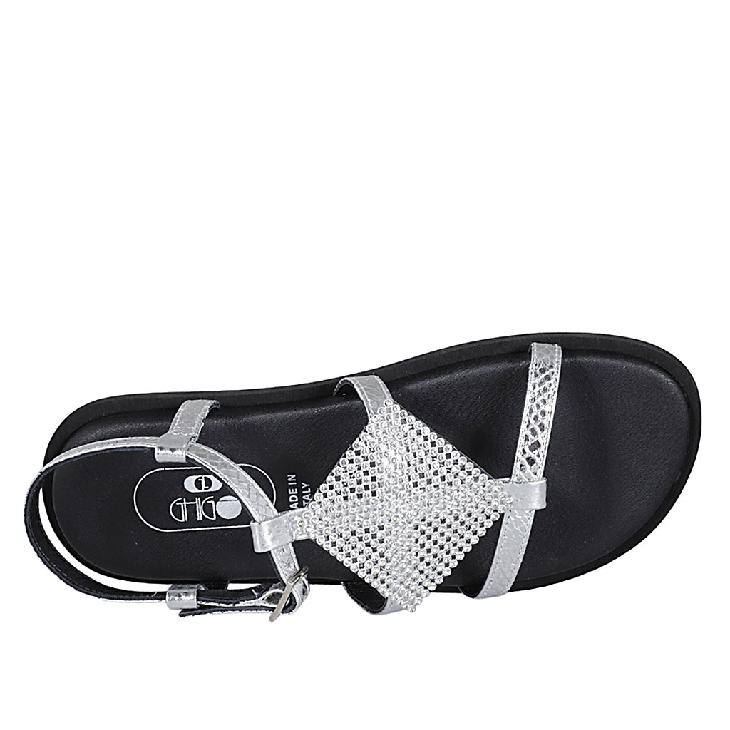 Sandalia con cinturon y estrás para mujer en piel imprimida laminada plateada cuña 1
