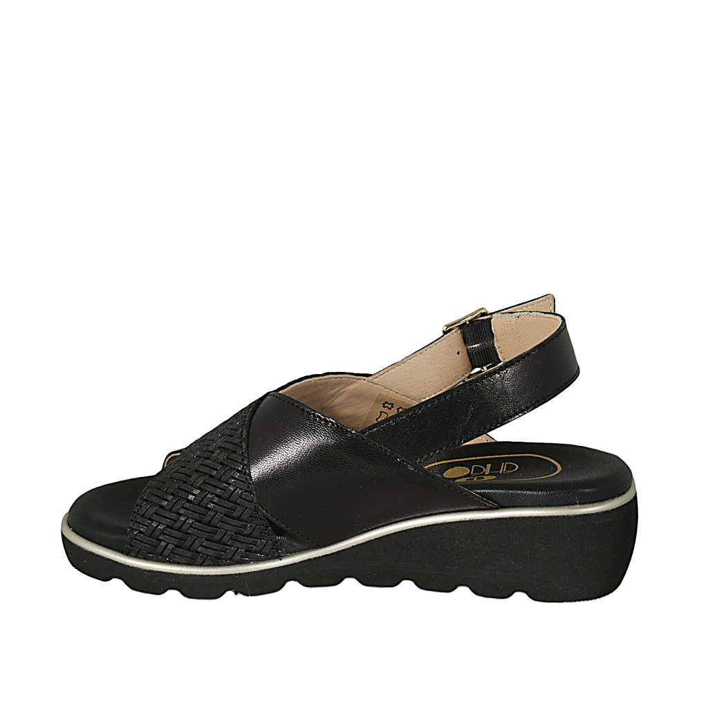 Sandalia para mujer en piel y piel trensada negra cuña 4 - Tallas disponibles:  42
