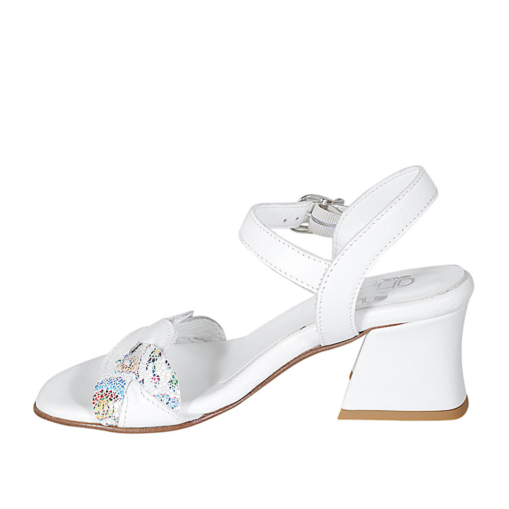 Sandalia para mujer con cinturon en piel blanca y imprimida mosaico multicolor tacon 6