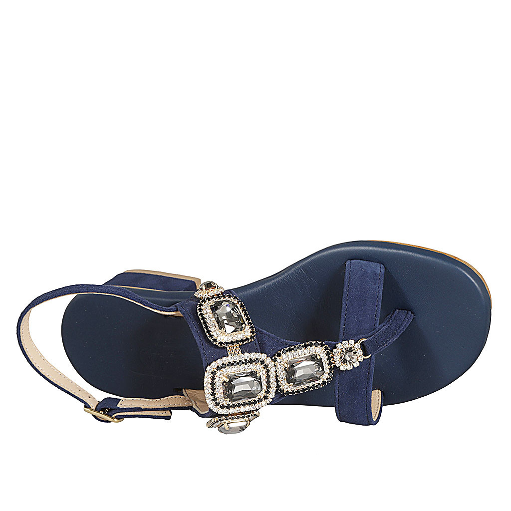 Sandalia de dedo para mujer en gamuza azul con pedreria de cristal a forma cuadrada tacon 4 - Tallas disponibles:  32, 44