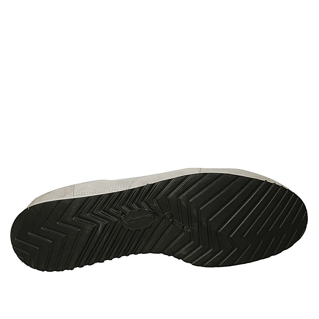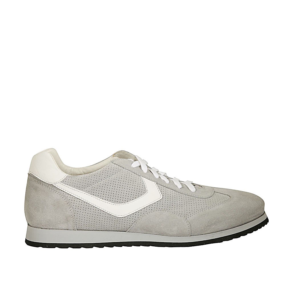 Zapato deportivo para hombre con cordones en gamuza y gamuza perforada gris y piel blanca