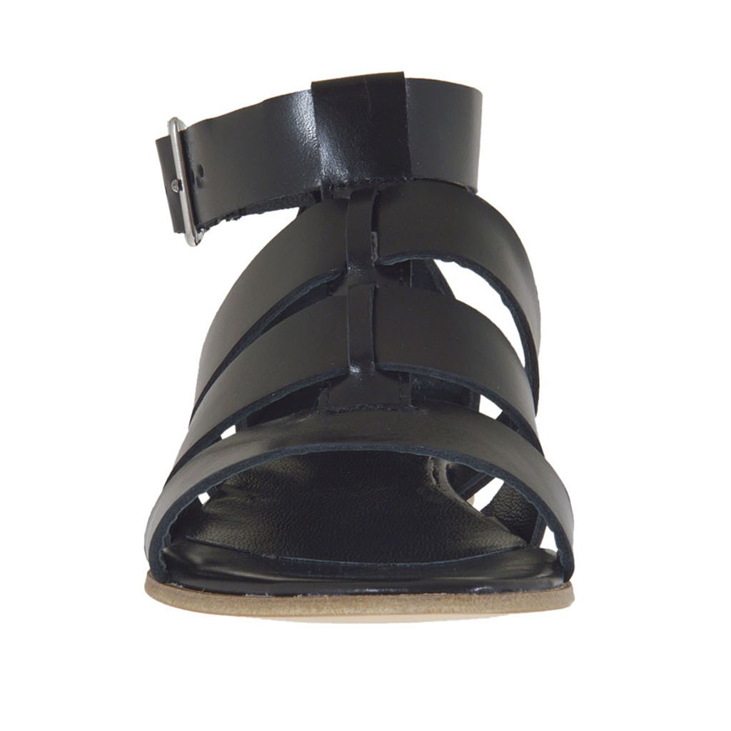 Zapato abierto en tiras con cinturon, altura tacon 1 cm. en piel de color negro, fondo en cuero, forro en piel. Disponible en tallas pequeñas y en tallas grandes.