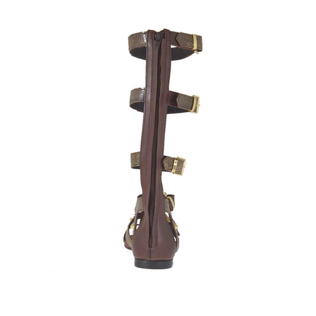 Zapato abierto estilo gladiador para mujer con cremallera, hebillas y tachuelas, altura tacon 1 cm, en piel y piel imprimida marron oscuro, fondo en cuero, forro en piel. Disponible en tallas pequeñas y grandes.
