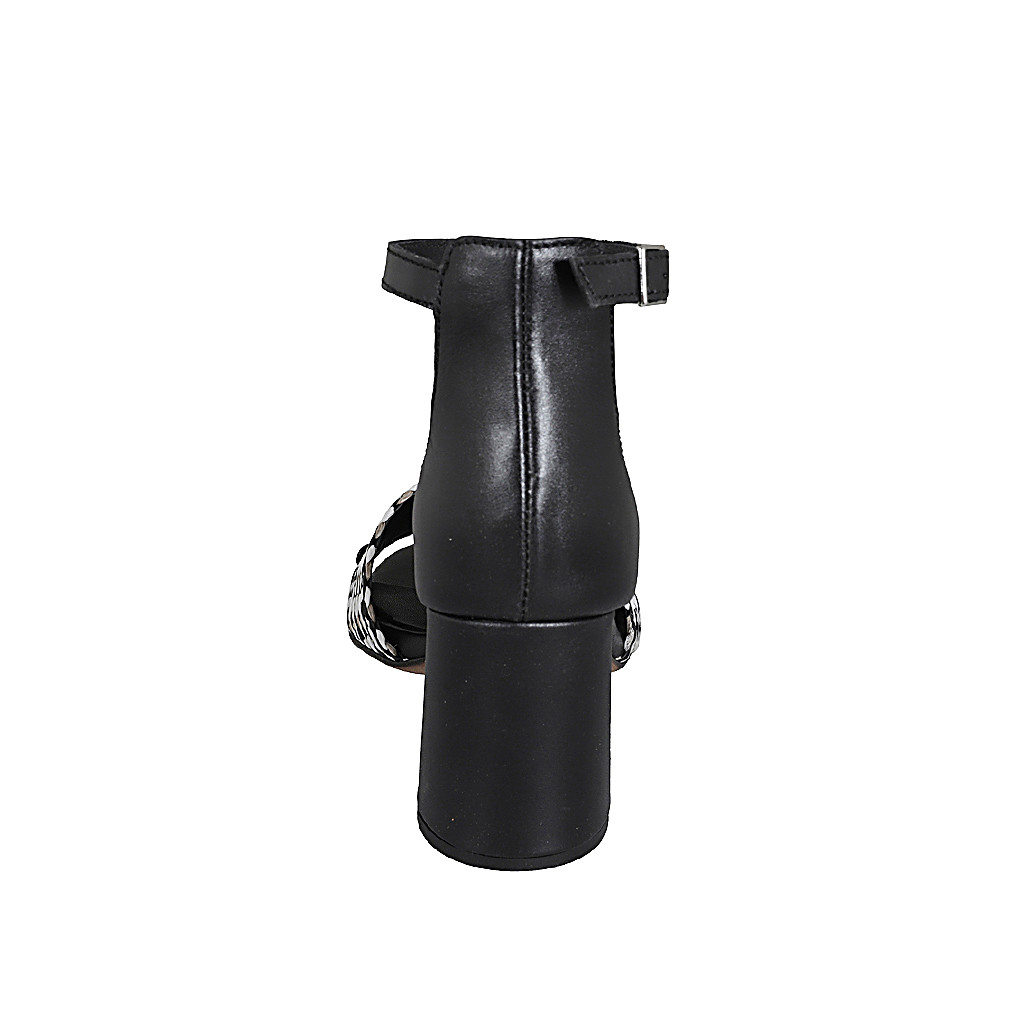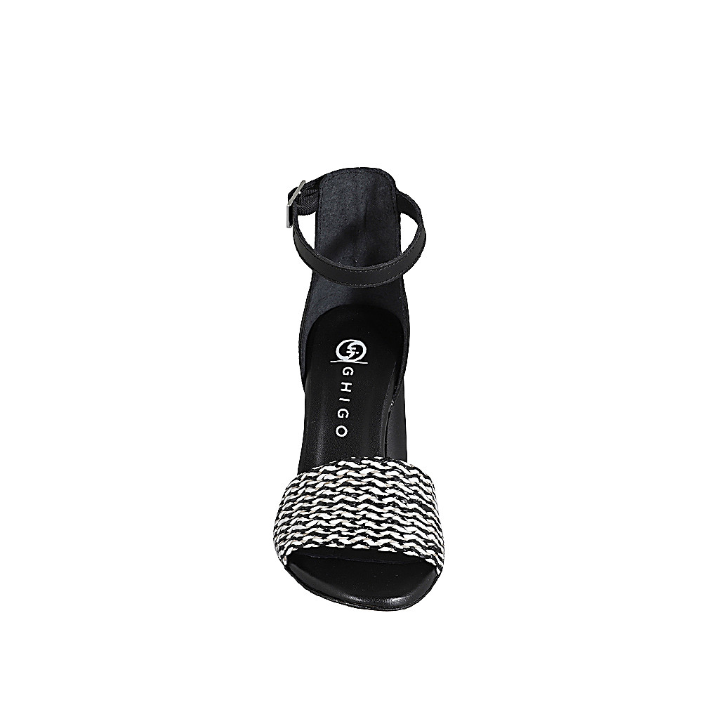 Zapato abierto para mujer en tejido denim blanco y piel cognac con cinturon cruzado tacon 10