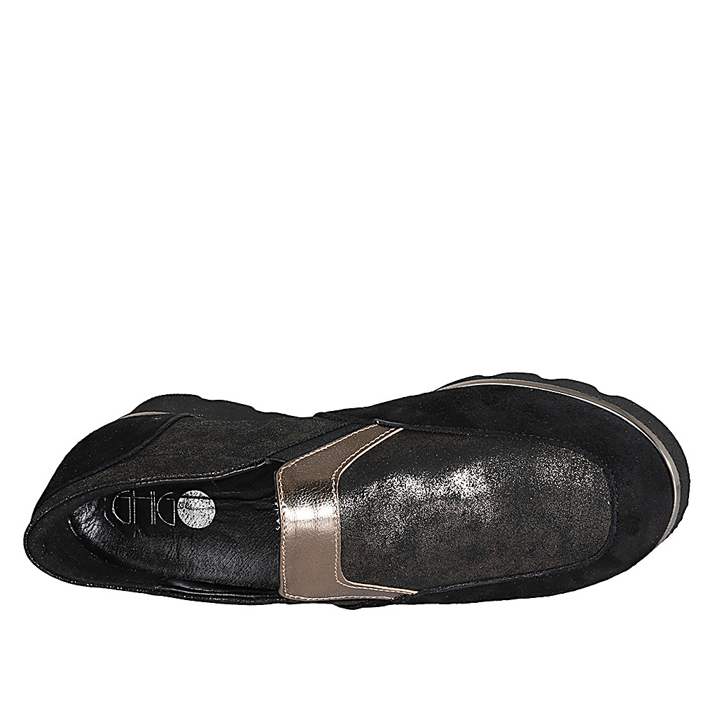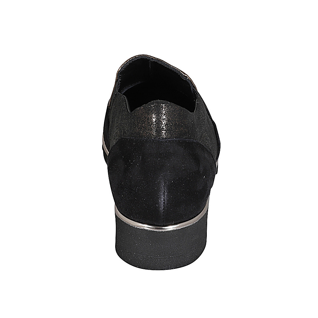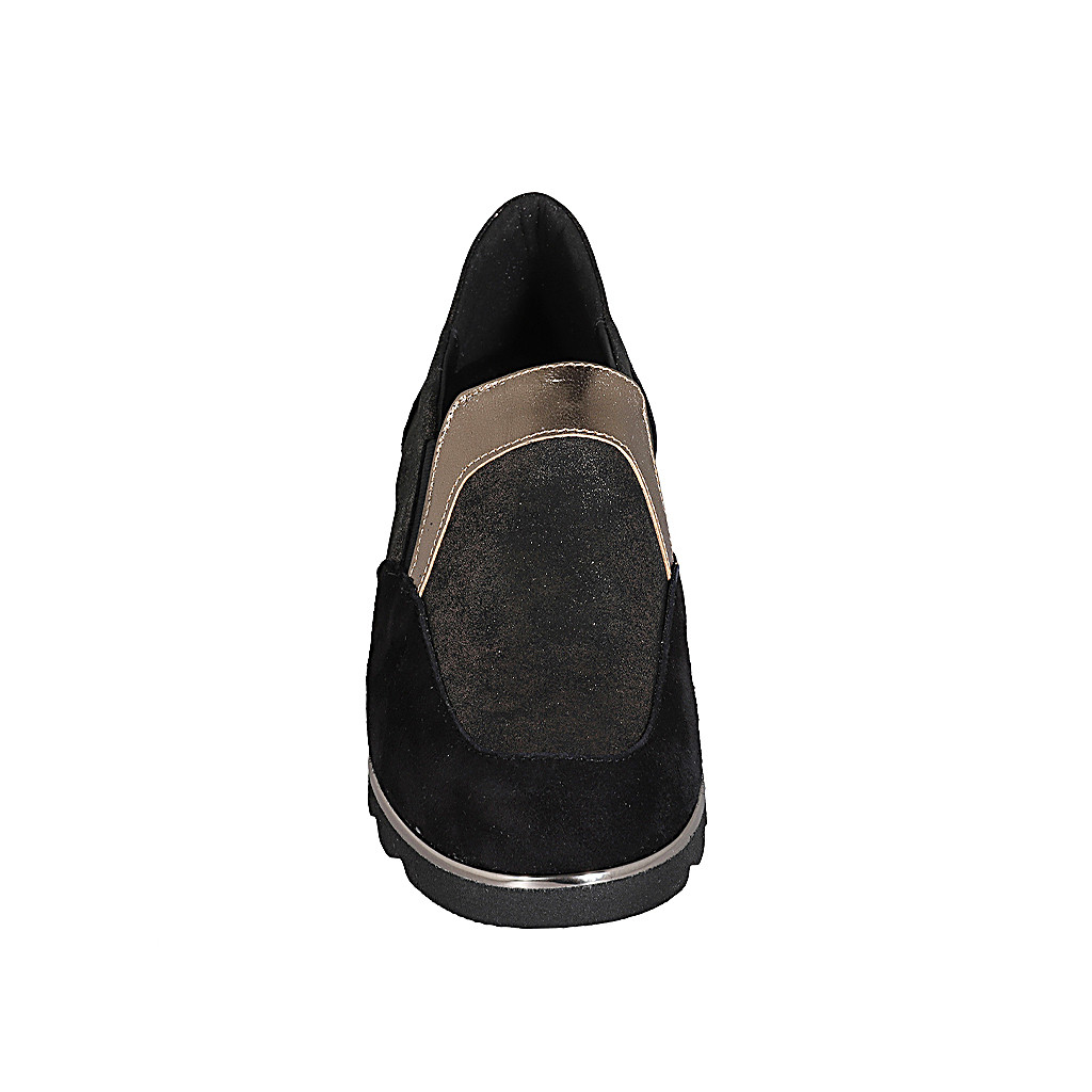 Mocasino para mujer con elasticos y plantilla extraible en gamuza negra y laminada latón cuña 3 - Tallas disponibles:  32