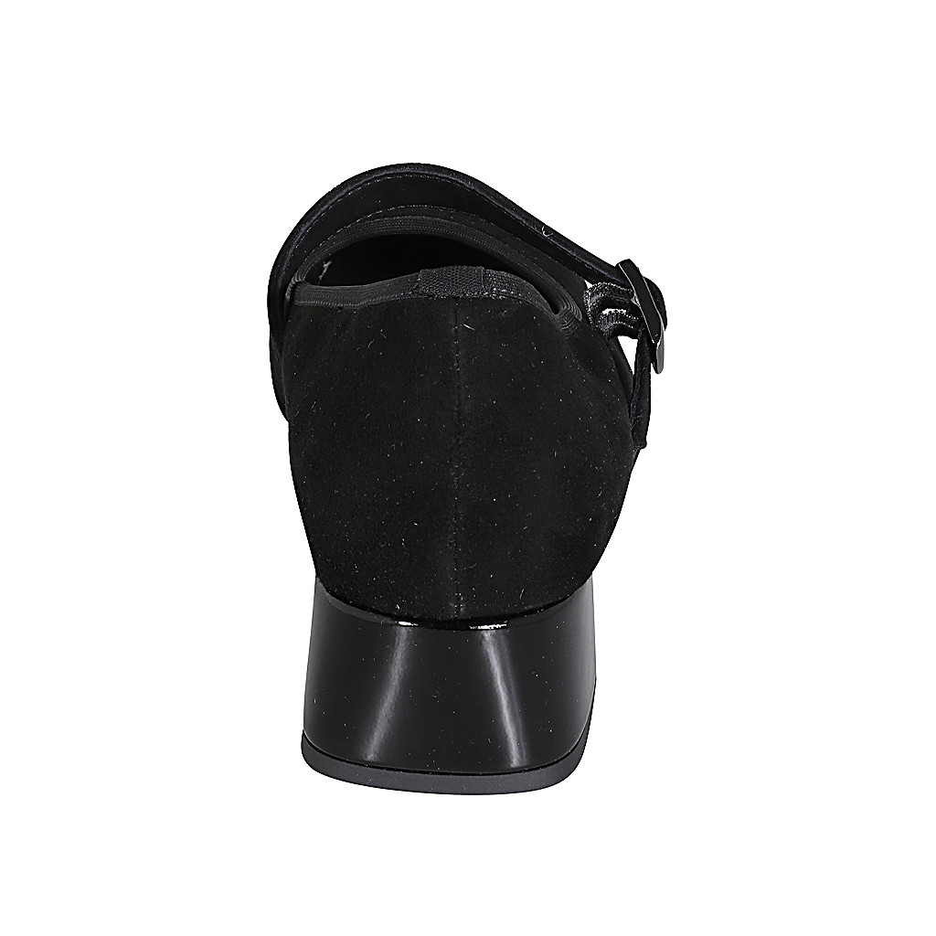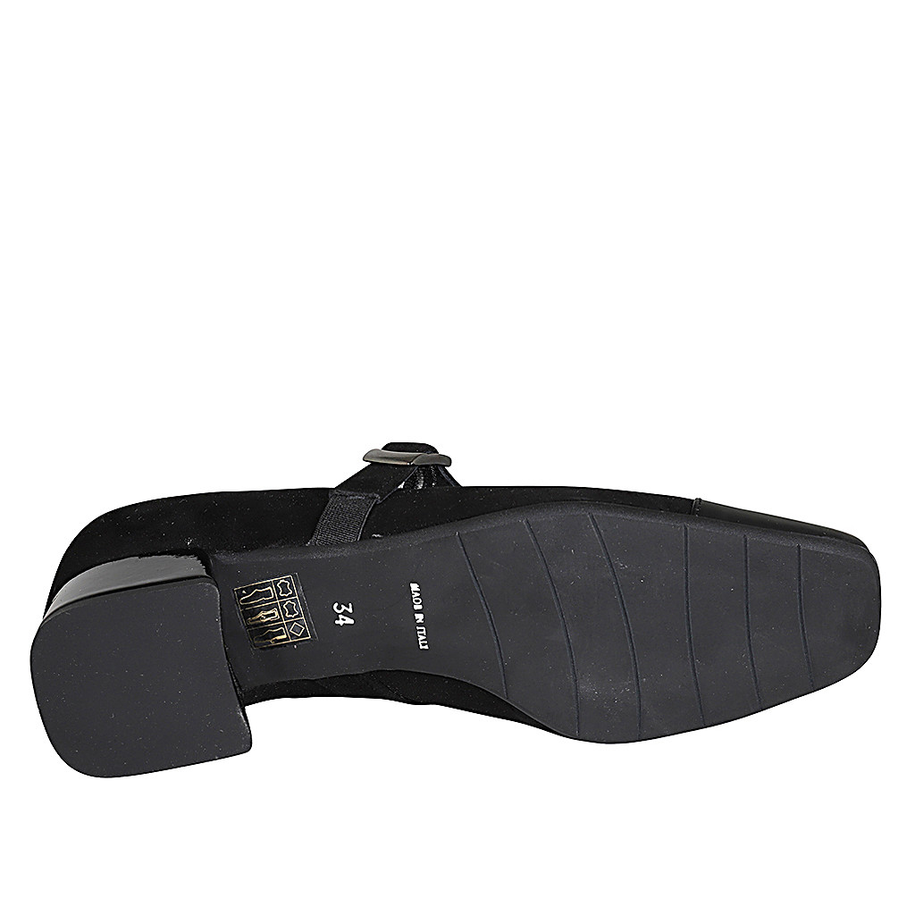 Mary Jane para mujer en gamuza y charol negro con correa elastica tacon 4