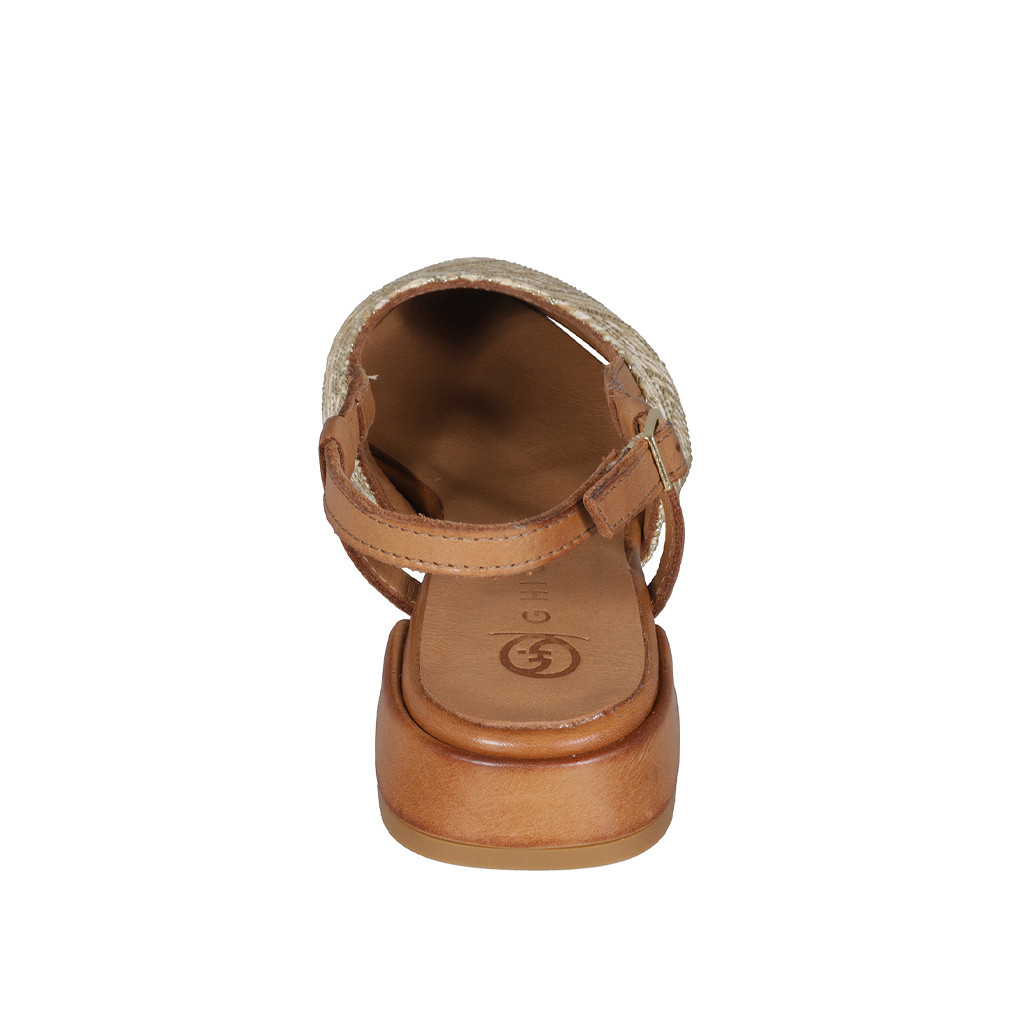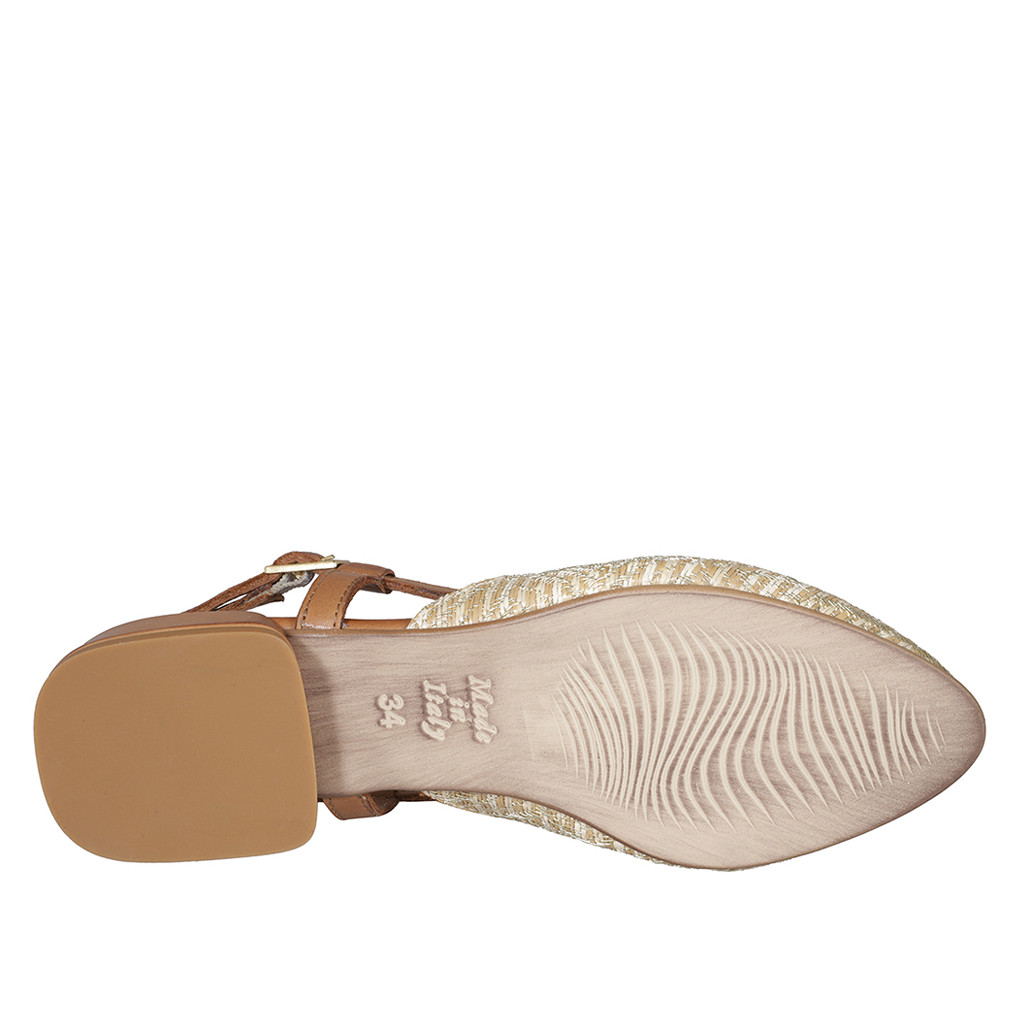 Zapato destalonado para mujer en rafia trensada con patrón geométrico beis, blanco y oro y piel cognac tacon 2 - Tallas disponibles:  35