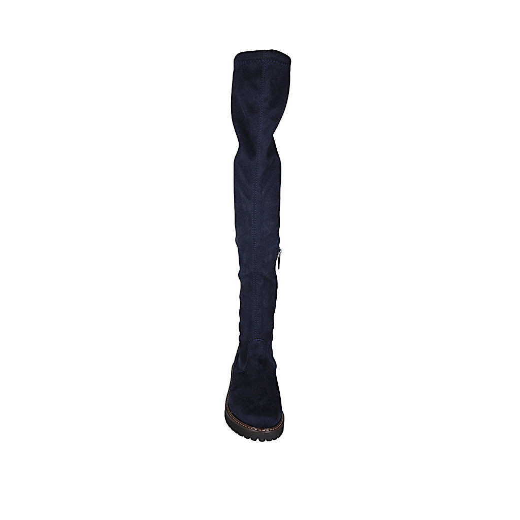 Bottes au dessus de genou pour femmes en daim et matériau elastique bleu avec demi fermeture éclair talon 3