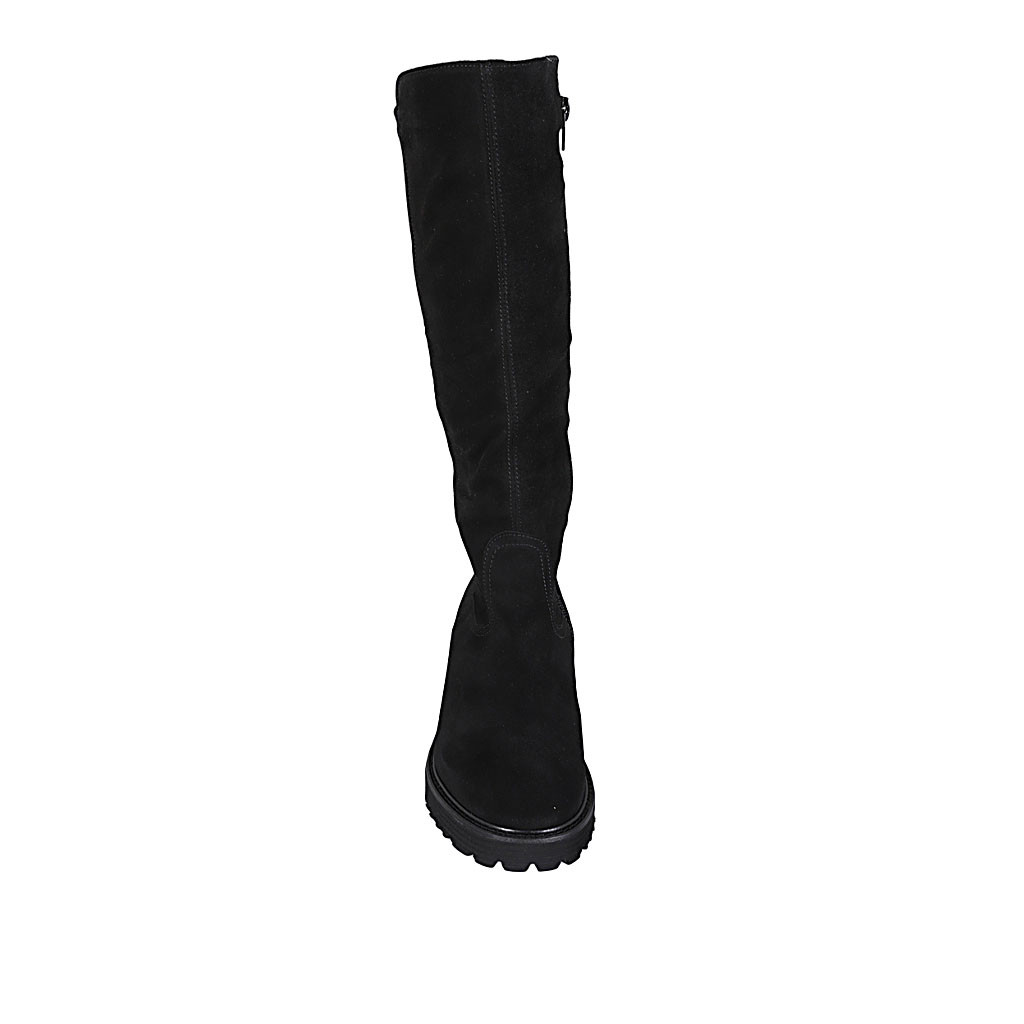Mule pour femmes en cuir et daim laminé noir avec fermeture velcro, plateforme et talon compensé 7