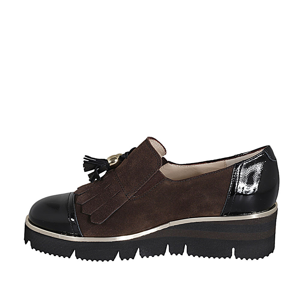 Mocassin pour femmes avec accessoire en cuir blanc, nue et imprimé multicouleur talon compensé 4