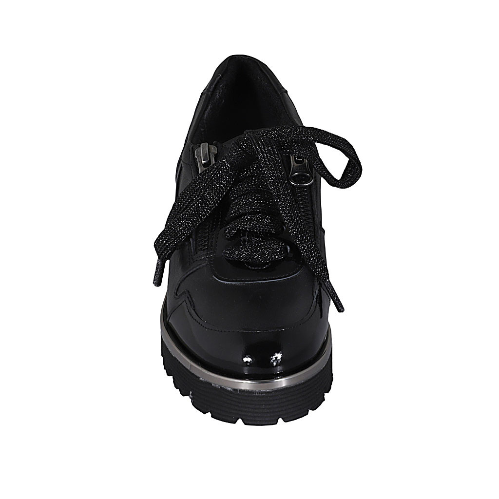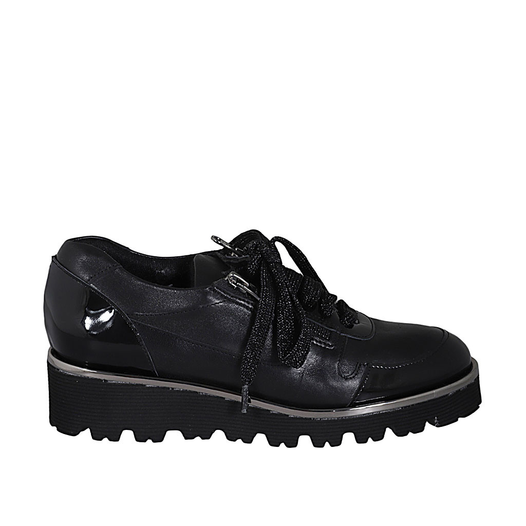 Chaussure à lacets pour femmes avec fermeture éclair en cuir et cuir verni noir talon compensé 4 - Pointures disponibles:  44