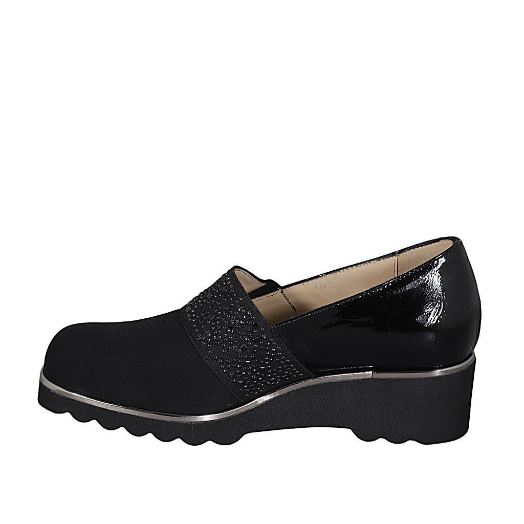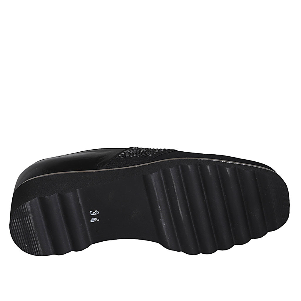 Chaussure pour femmes avec semelle amovible, elastique et strass en cuir verni et tissu noir talon compensé 4 - Pointures disponibles:  42, 43, 45