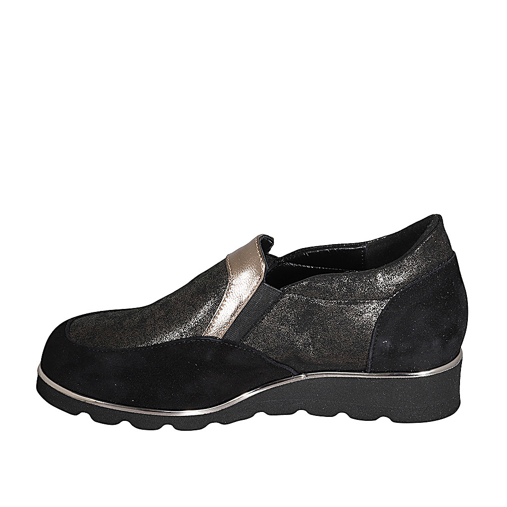 Sandale pour femmes en daim noir, cuir lamé bronze et tissu resillé talon 8