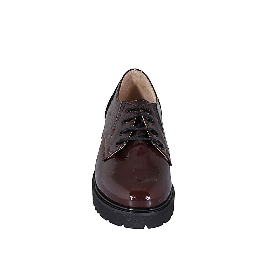 Chaussure derby pour femmes en cuir vernì bordeaux avec elastiques talon 4