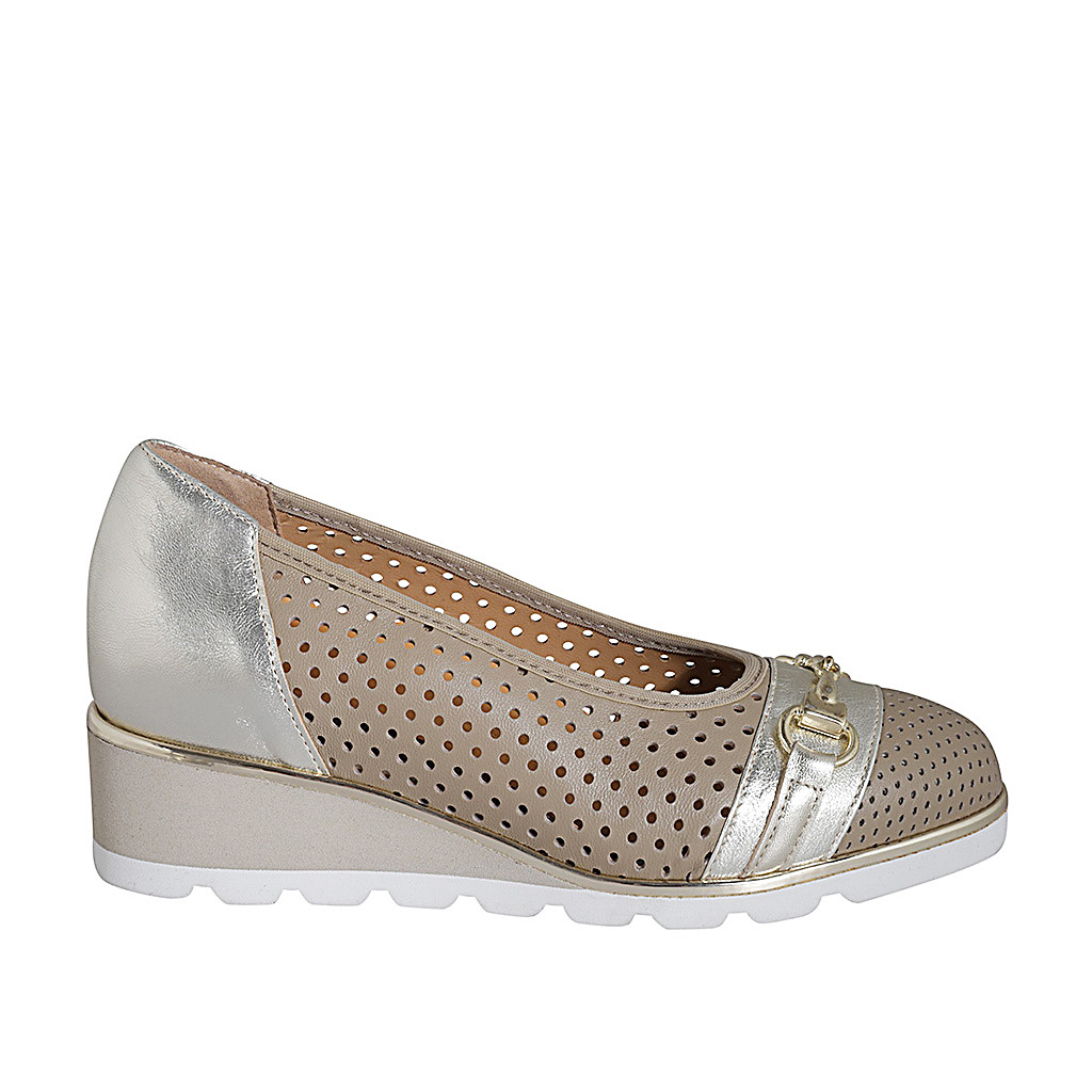 Escarpin pour femmes avec semelle amovible et accessoire en cuir perforé beige et laminé platine talon compensé 4