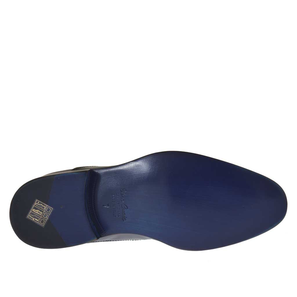 Elégant homme chaussre avec lacets en option, en cuir et cuir verni bleu foncé, semelle en cuir, doublure en cuir. Disponible dasn les petites et grandes tailles.