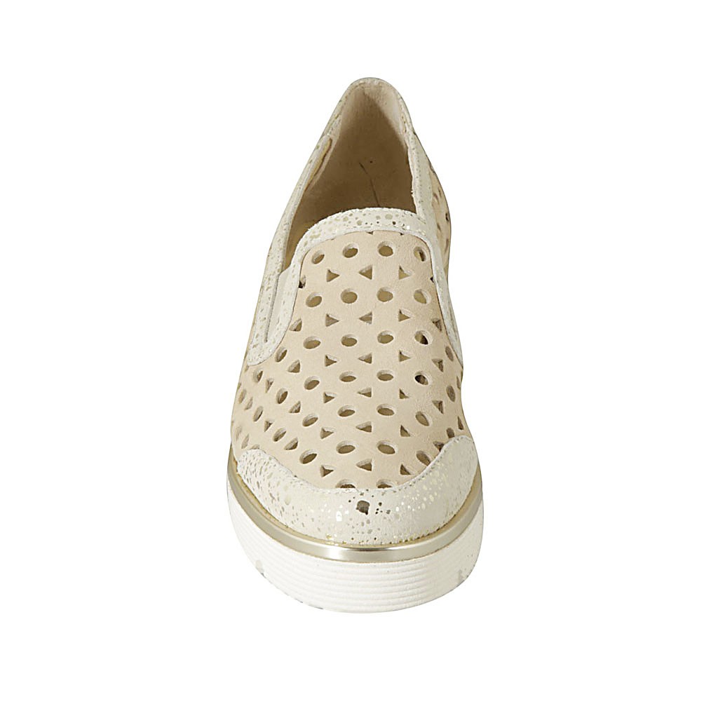 Mocassin pour femmes avec elastiques en daim perforé beige et lamé platine talon compensé 4 - Pointures disponibles:  42
