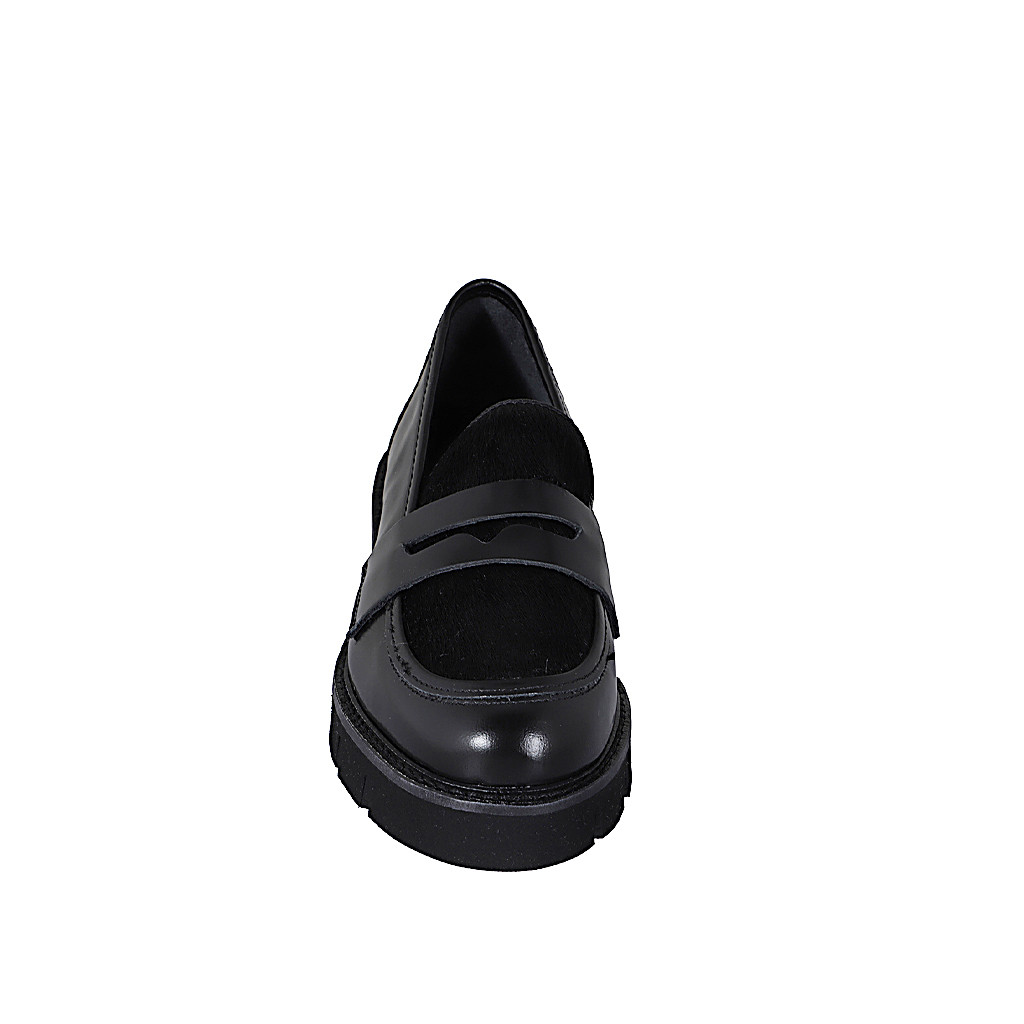Mocassin pour femmes en cuir brossé noir et fourrure noir talon 3 - Pointures disponibles:  32, 33, 34, 35, 42, 43, 44, 45, 46