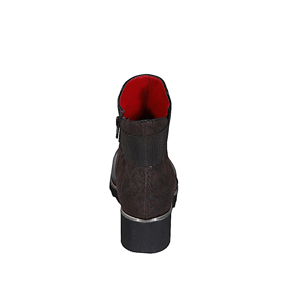 Bottines pour femmes en cuir imprimé et cuir marron foncé avec fermeture éclair, elastique et semelle amovible talon compensé 4