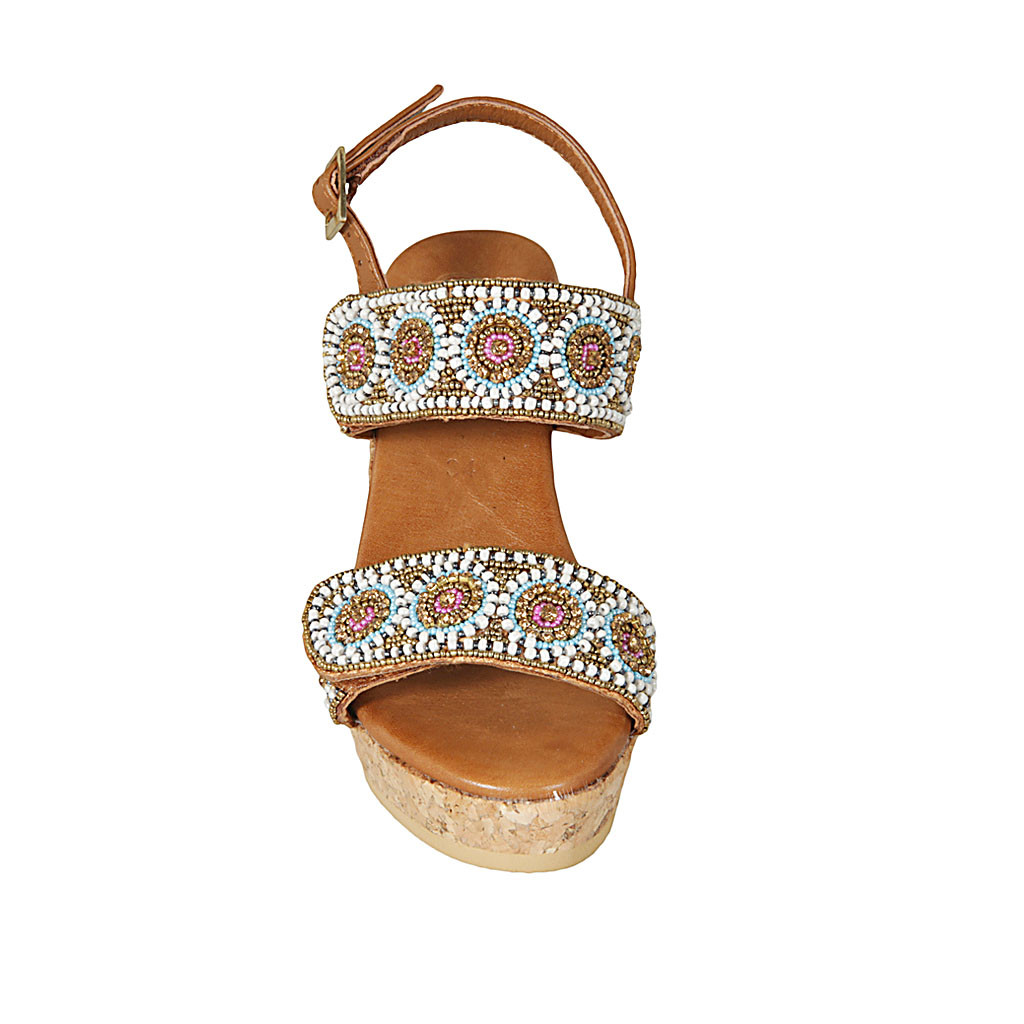 Sandale pour femmes en cuir cognac avec fermetures velcro, perles et talon compensé 9