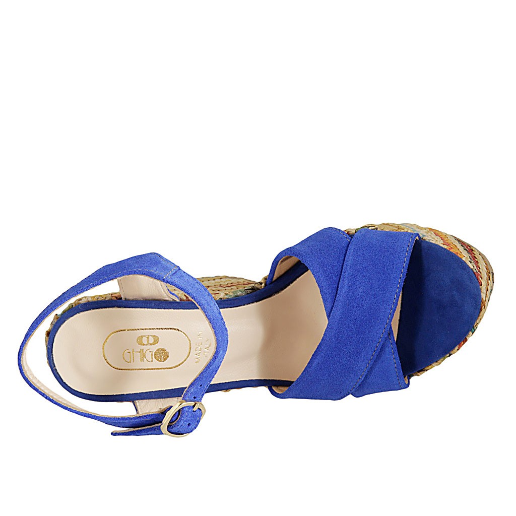 Sandale pour femmes avec plateforme et courroie en daim bleuet et tissu multicouleur talon compensé 12 - Pointures disponibles:  42