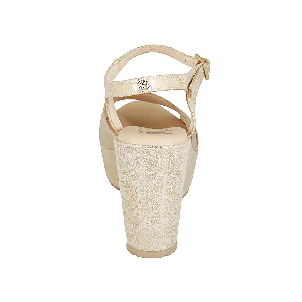 Sandale pour femmes en daim imprimé et lamé platine et taupe avec courroie, plateforme et talon compensé 9