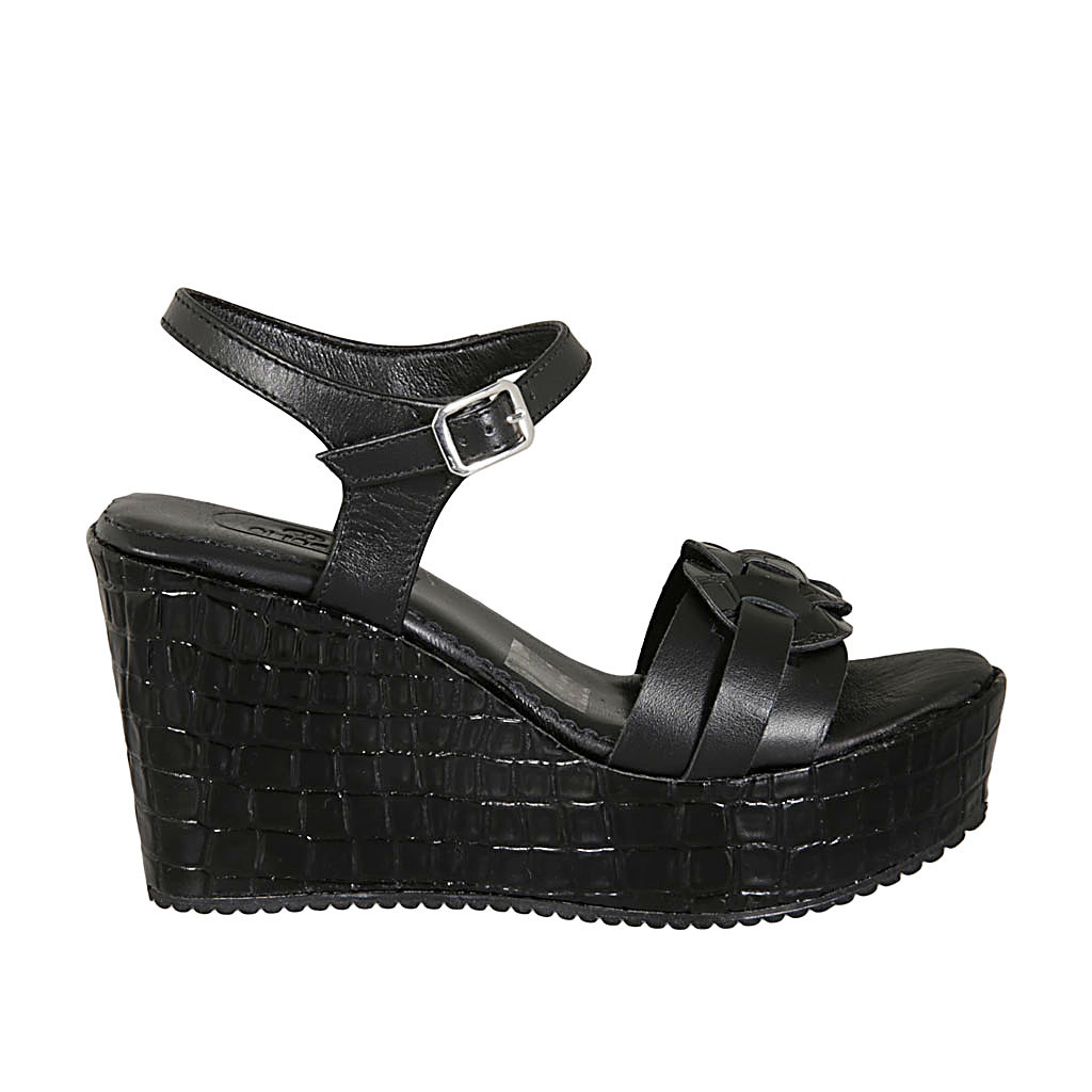 Sandale pour femmes en cuir noir avec courroie, plateforme et talon compensé imprimé 9 - Pointures disponibles:  42