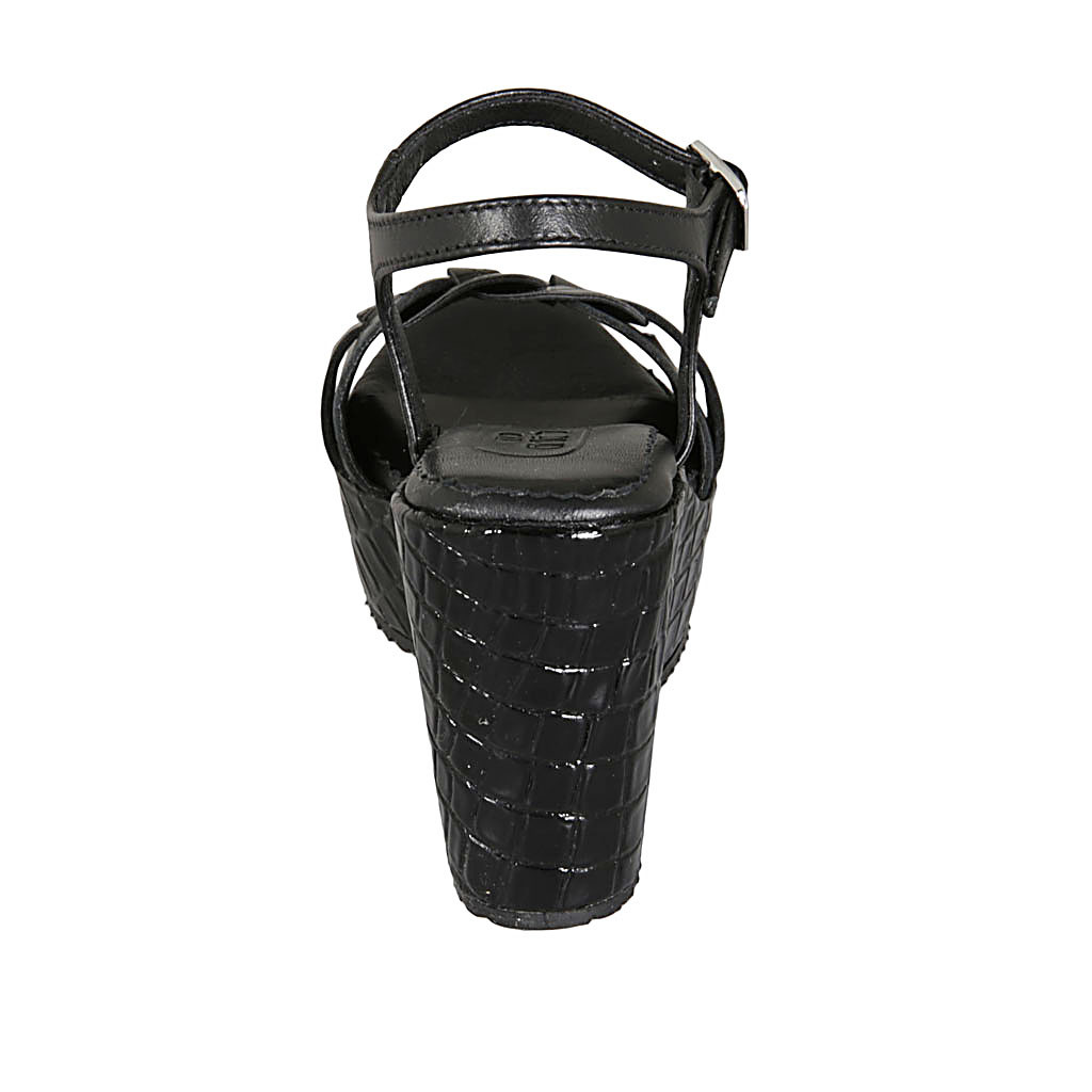 Sandale pour femmes en cuir noir avec courroie, plateforme et talon compensé imprimé 9