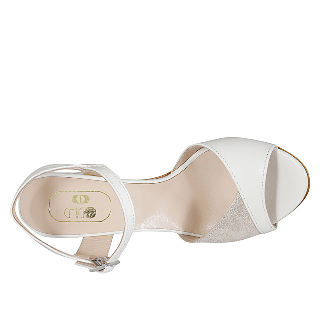 Sandale pour femmes avec courroie en cuir blanc et lamé platine talon 8