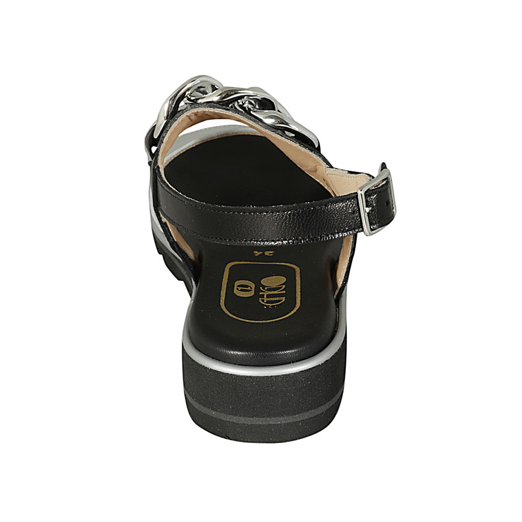 Sandale pour femmes avec chaîne en cuir noir et cuir lamé argent talon compensé 3 - Pointures disponibles:  42