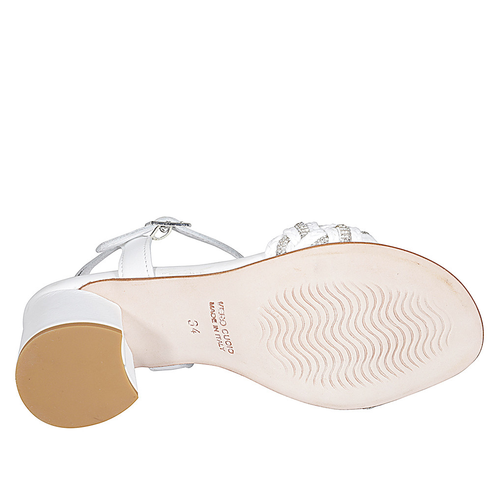 Sandale pour femmes en cuir et rafia blanc avec courroie à la cheville et strass talon 5