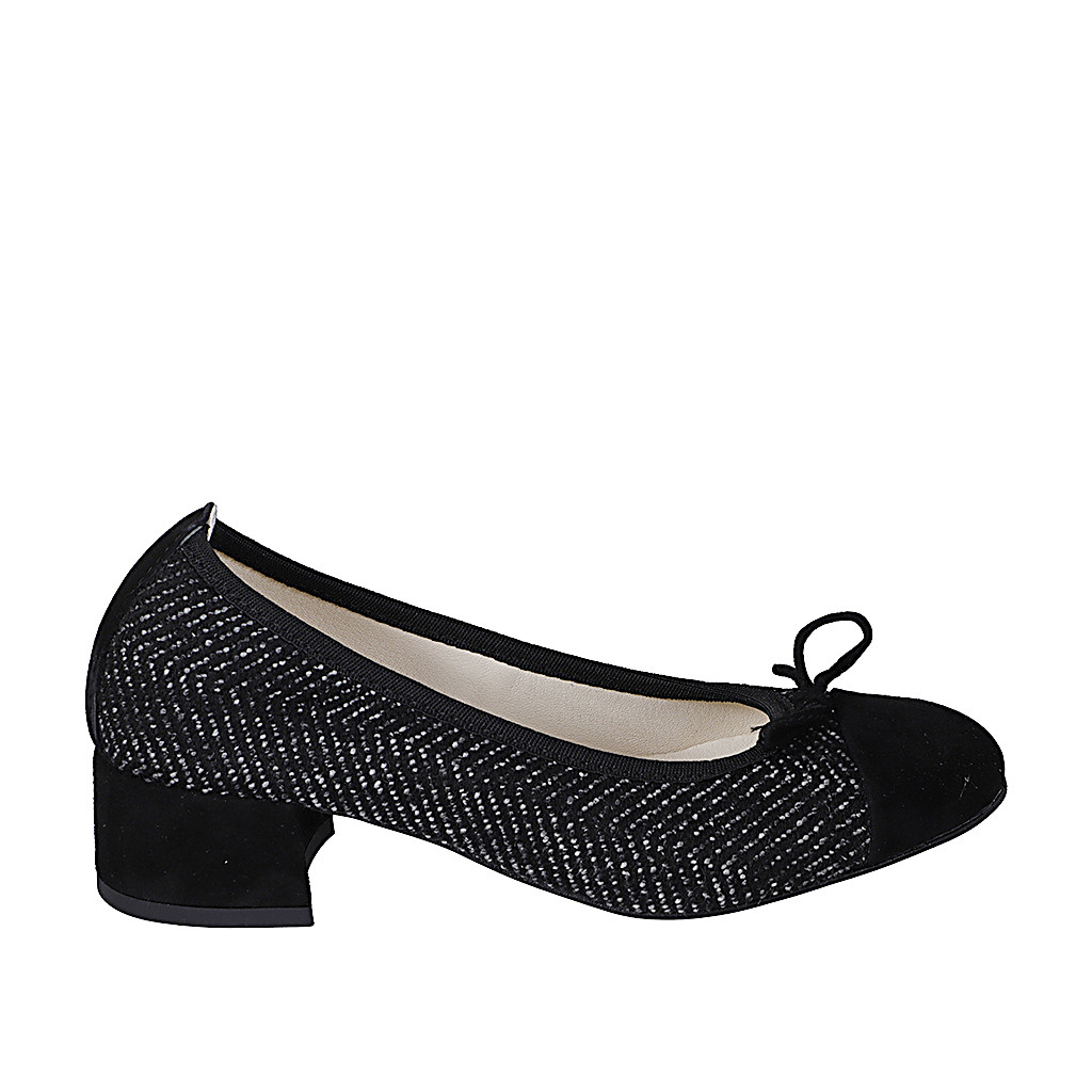 Ballerina con fiocco e puntale da donna in camoscio nero e tessuto bianco e nero tacco 4