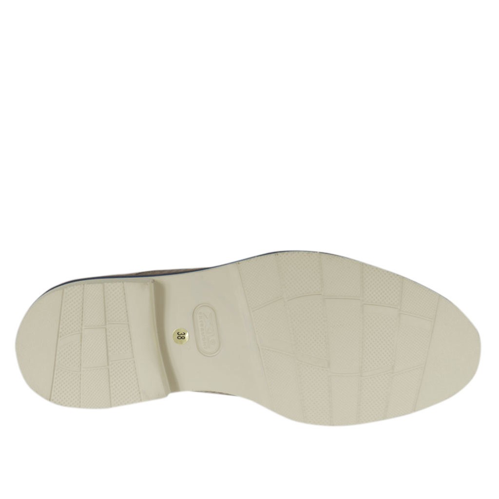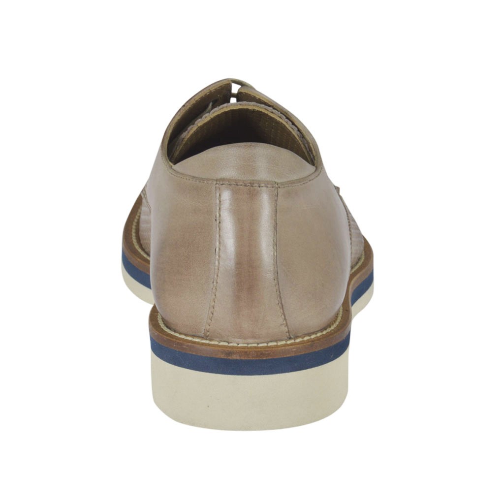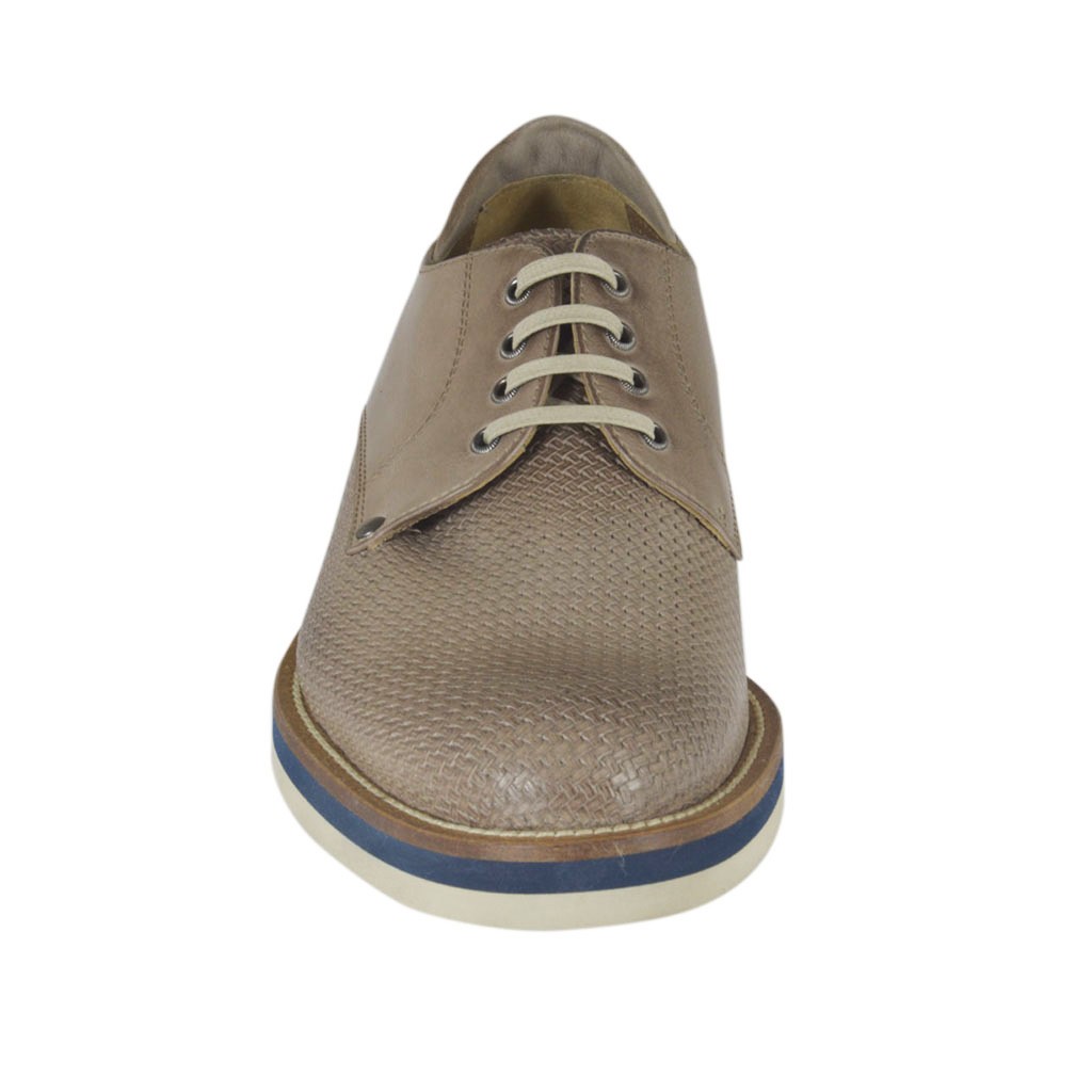 Scarpa casual stringata da uomo modello derby, in pelle e pelle stampata taupe, fondo gomma, fodera pelle. Disponibile nei numeri piccoli e grandi.