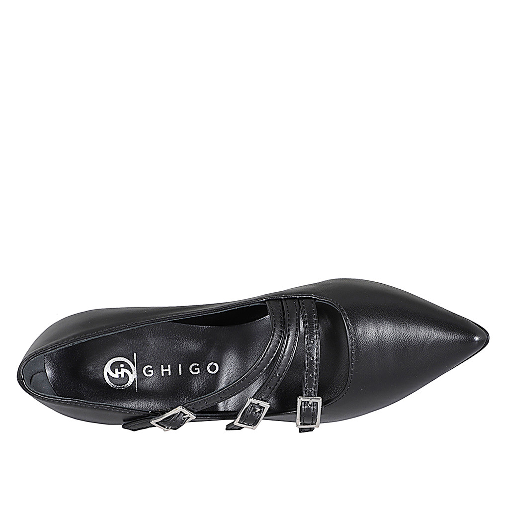 Decolté Mary Jane a punta con tre cinturini in pelle nera tacco 7