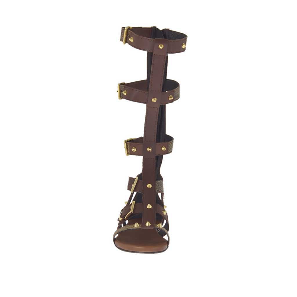 Scarpa aperta alla schiava da donna con cerniera, fibbie e borchie, altezza tacco cm. 1, in pelle e pelle stampata testa di moro, fondo cuoio, fodera pelle. Disponibile nei numeri piccoli e grandi.