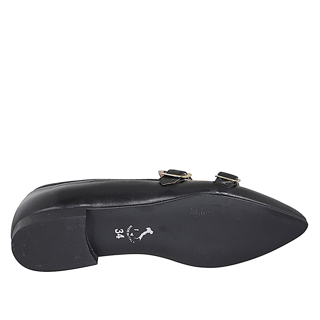 Mocassinio da donna a punta con doppia fibbia in pelle nera e camoscio maculato tacco 2