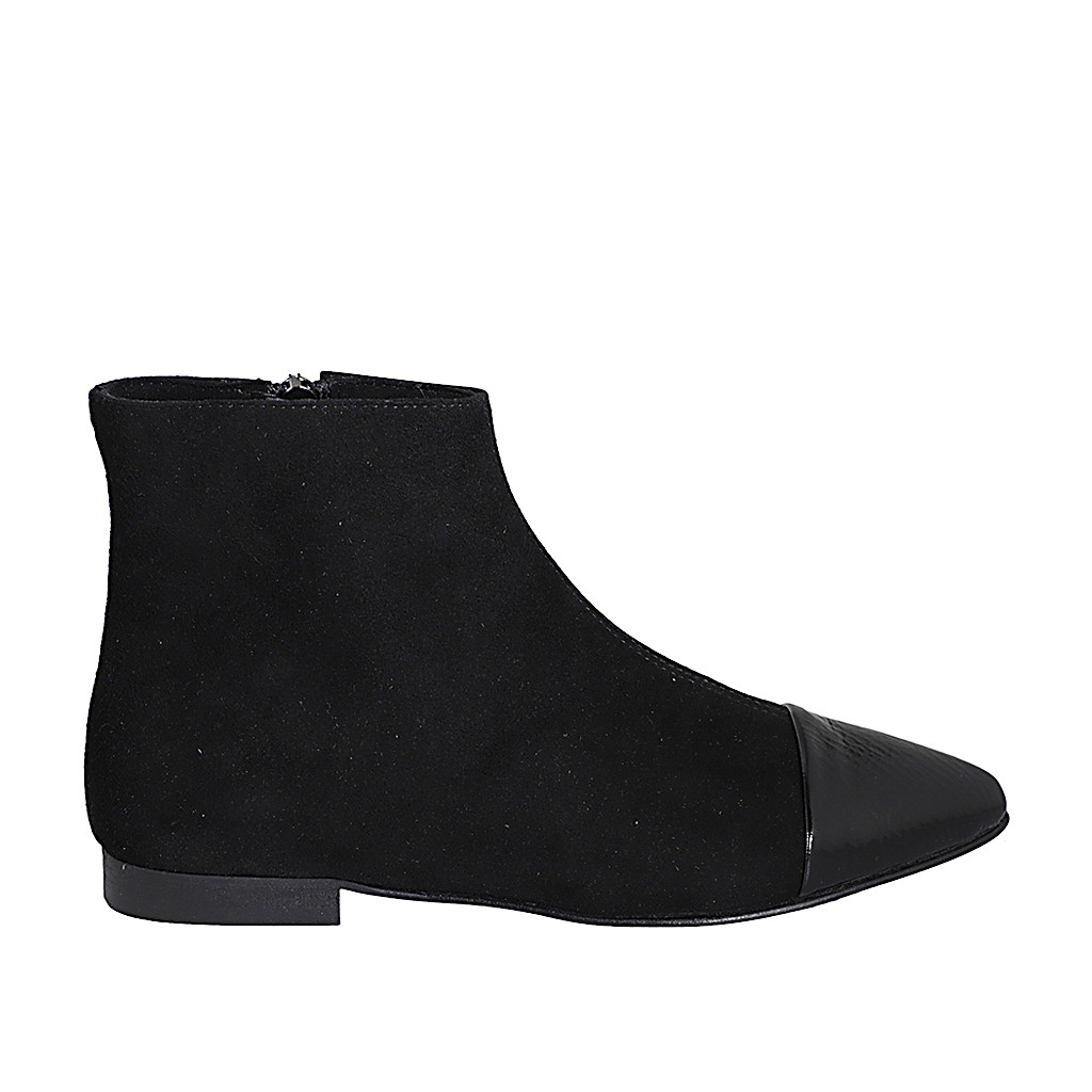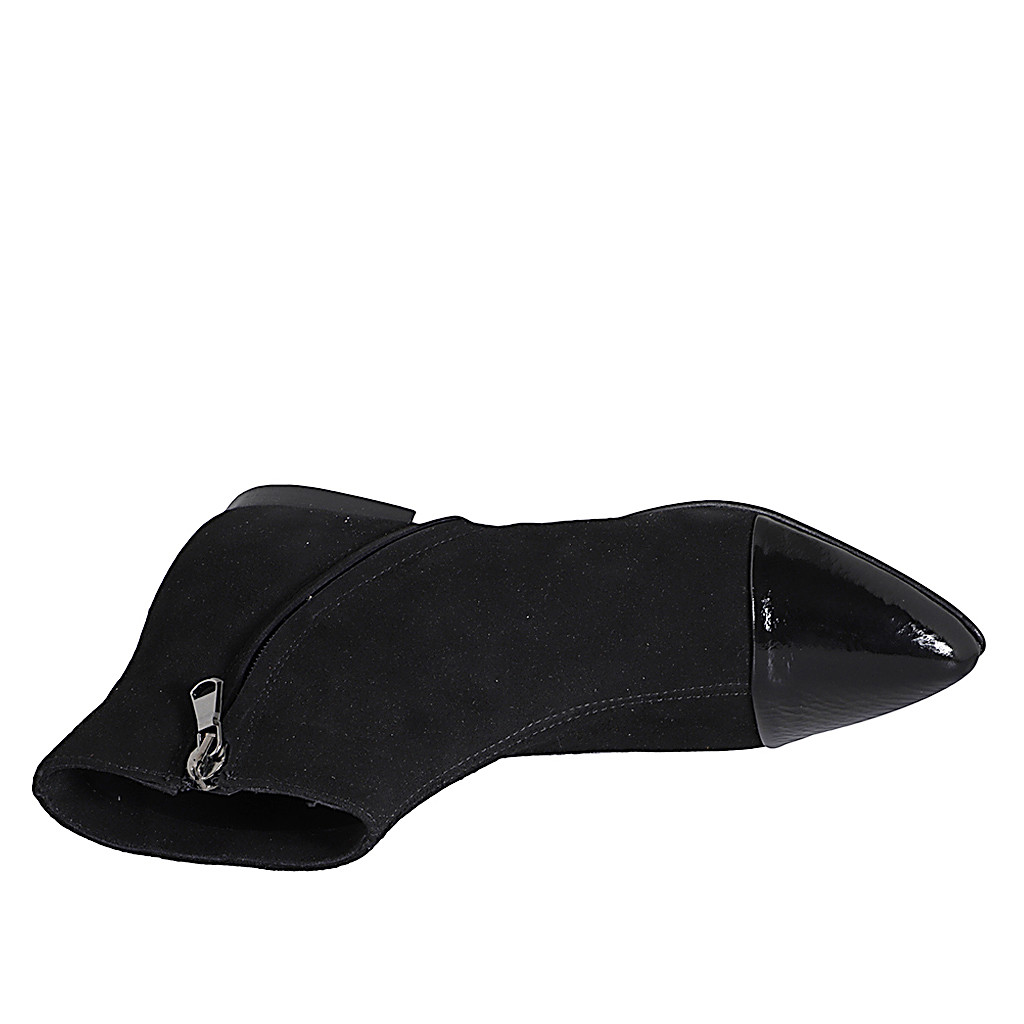 Stivaletto a punta da donna in camoscio nero con cerniera interna e puntale in vernice nera tacco 2