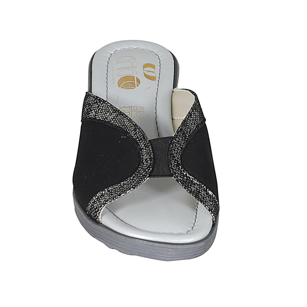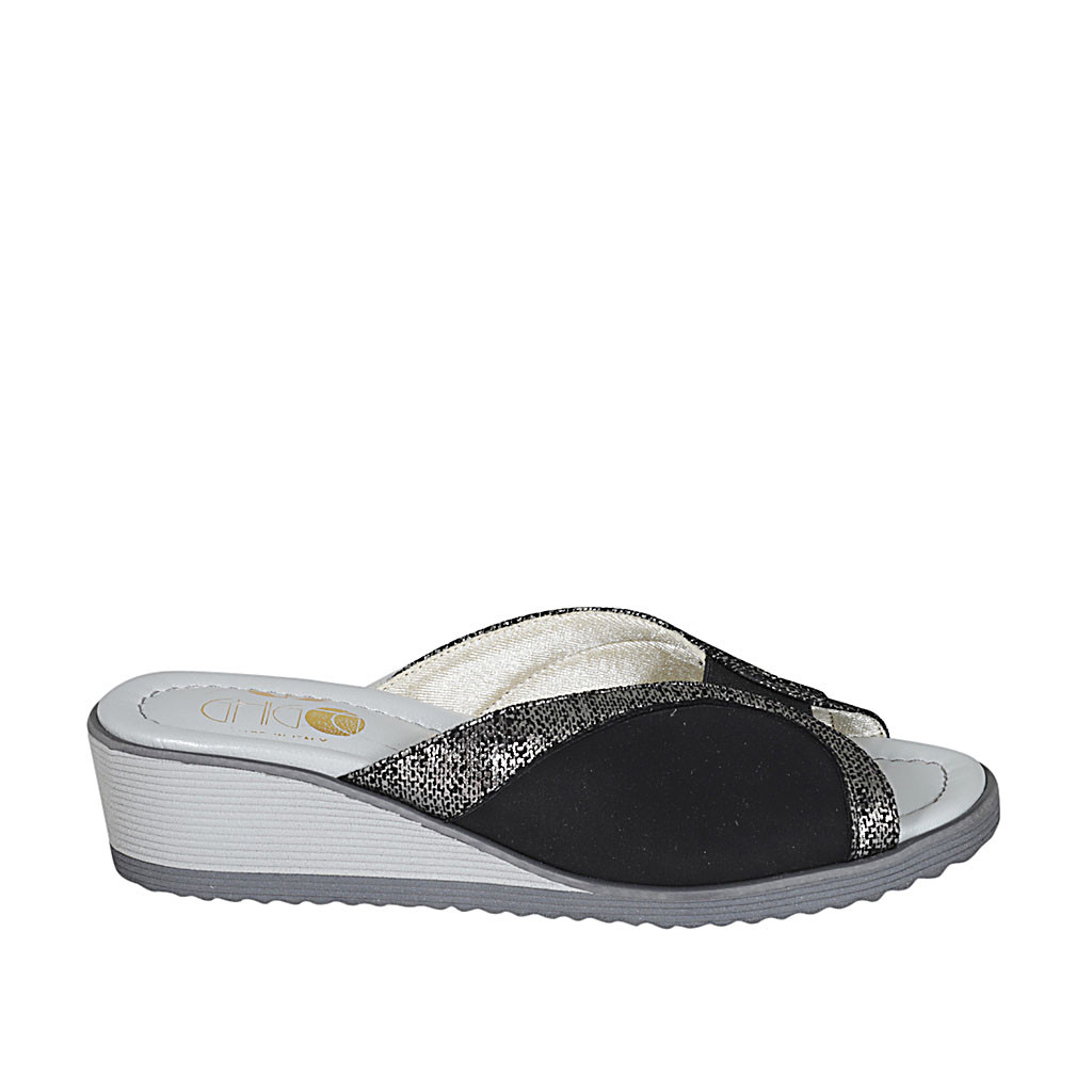Sabot da donna con elastico in camoscio nero e stampato laminato argento zeppa 4 - Misure disponibili: 43