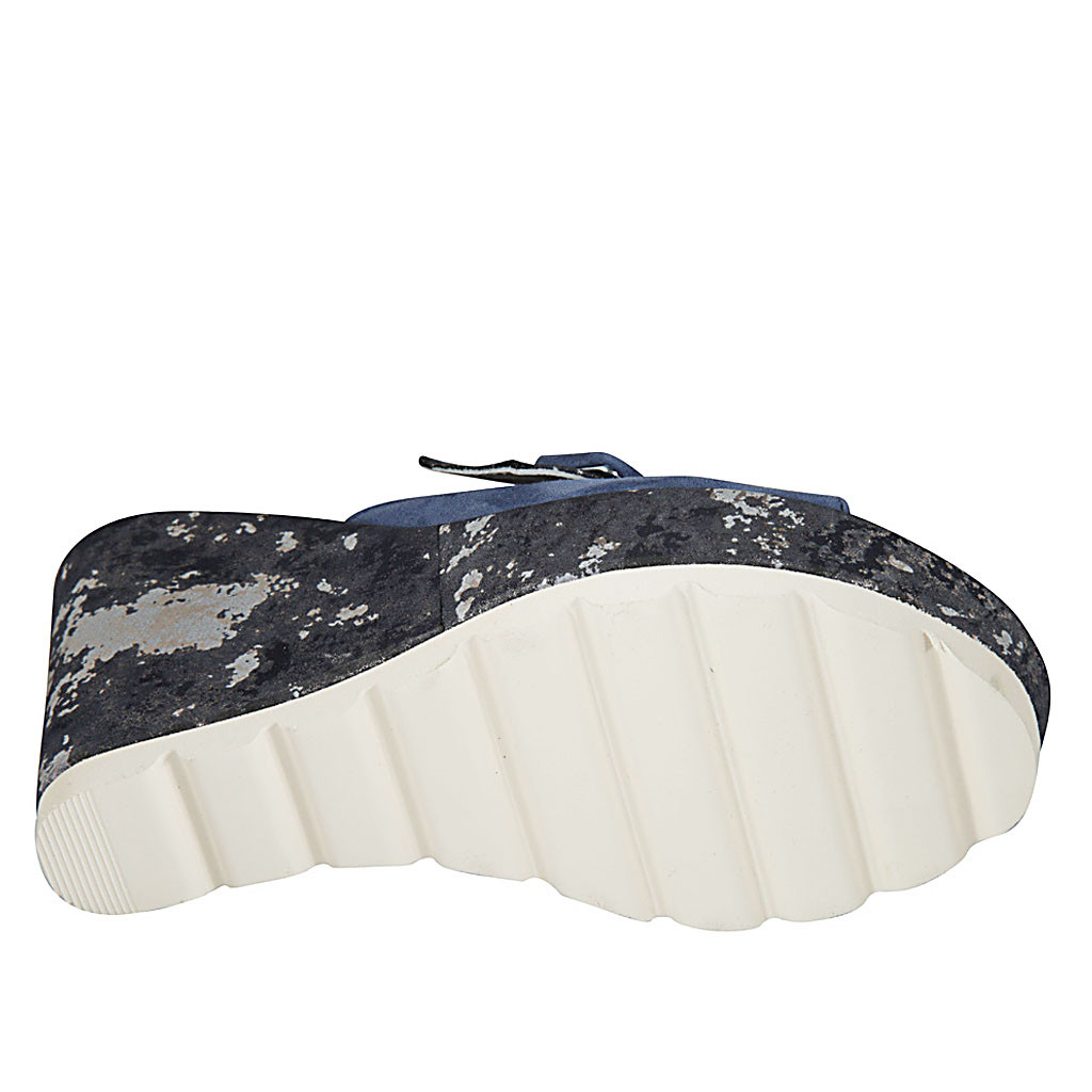 Sabot da donna con fibbia in camoscio bluette e laminato stampato blu e argento zeppa 10