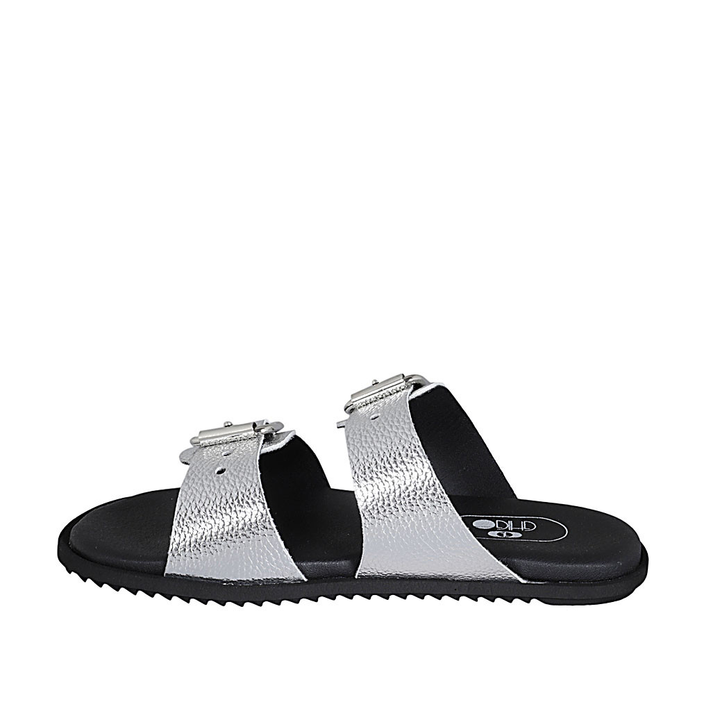 Sabot da donna con fibbie regolabili in pelle stampata laminata argento zeppa 1