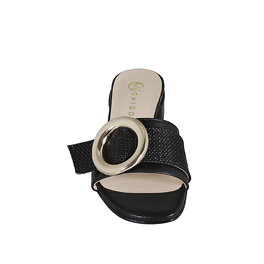 Sabot da donna in pelle e rafia nera con fibbia tacco 3
