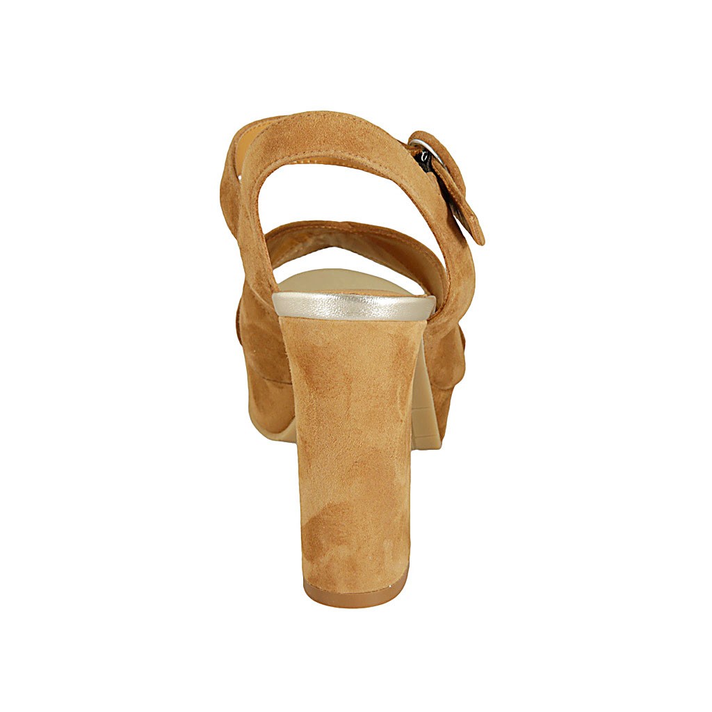 Sandalo da donna in camoscio color cuoio e pelle laminata platino con cinturino, plateau e tacco 9 - Misure disponibili: 42