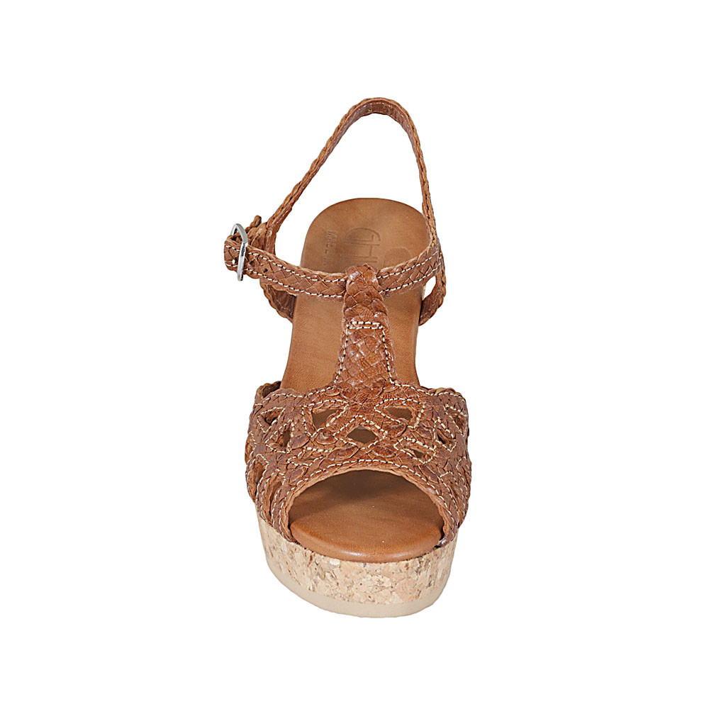 Sandalo da donna in pelle intrecciata color cuoio con cinturino plateau e zeppa 9 - Misure disponibili: 43, 44