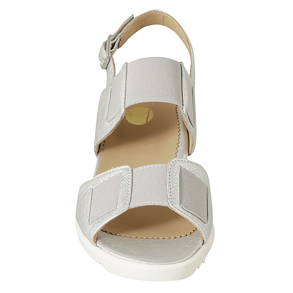 Sandalo da donna con elastici in pelle laminata argento zeppa 5