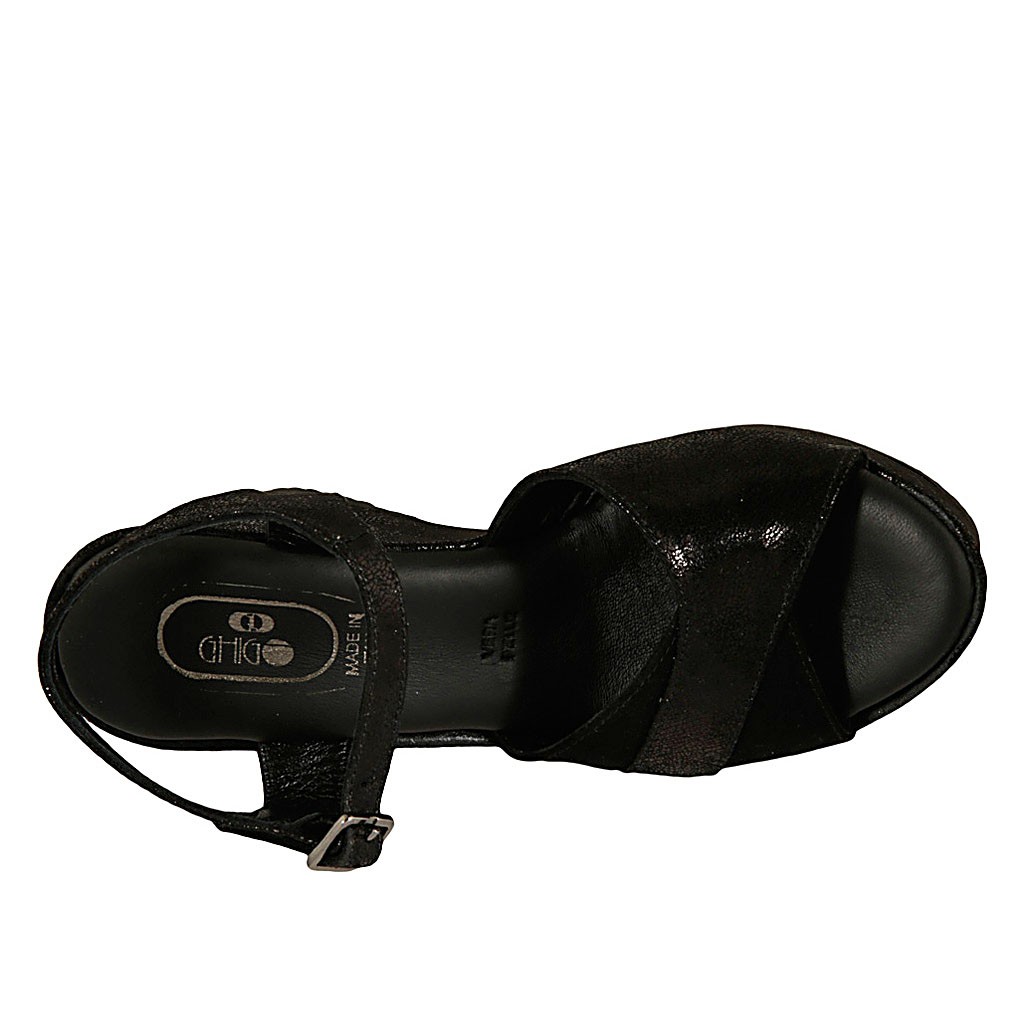 Sandalo da donna in camoscio stampato e laminato nero con cinturino, plateau e zeppa 9